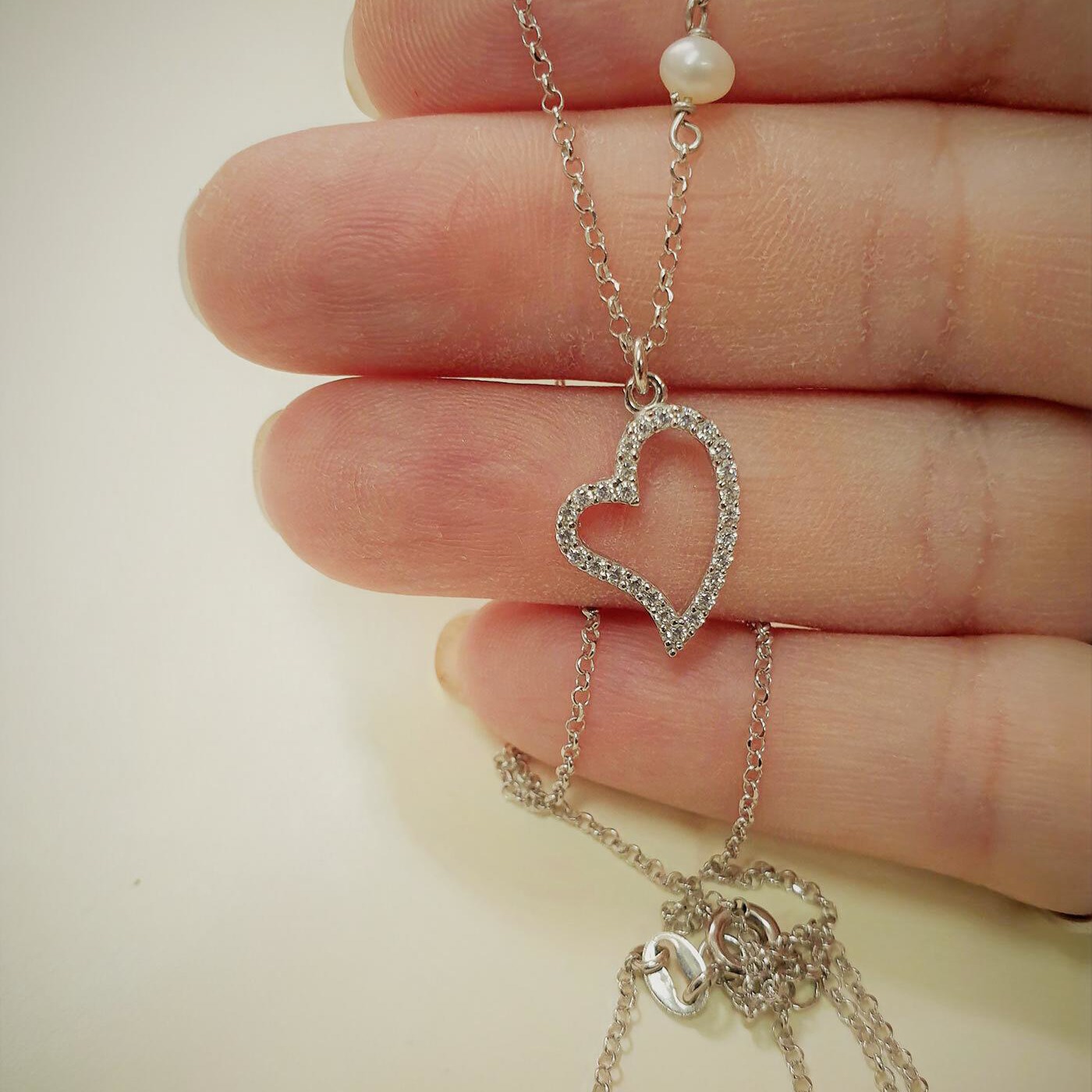 Καρδιά με λευκά ζιργκόν, ασήμι 925 και μαργαριτάρι στο πλάι.