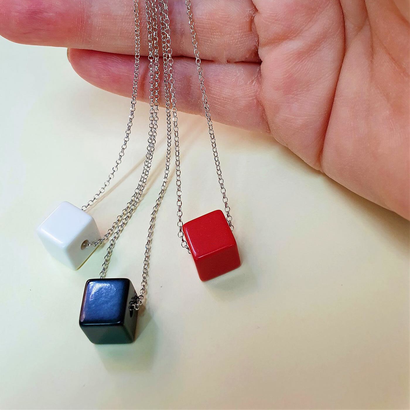 Κολιέ κύβος από πάστα κοράλι το κόκκινο και το λευκό, πάστα όνυχα το μαύρο με ασημένια αλυσίδα 925.
