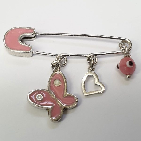Παραμάνα με ροζ σμάλτο ασήμι 925 για κορίτσι, με πεταλούδα καρδούλα και γυάλινο ματάκι.