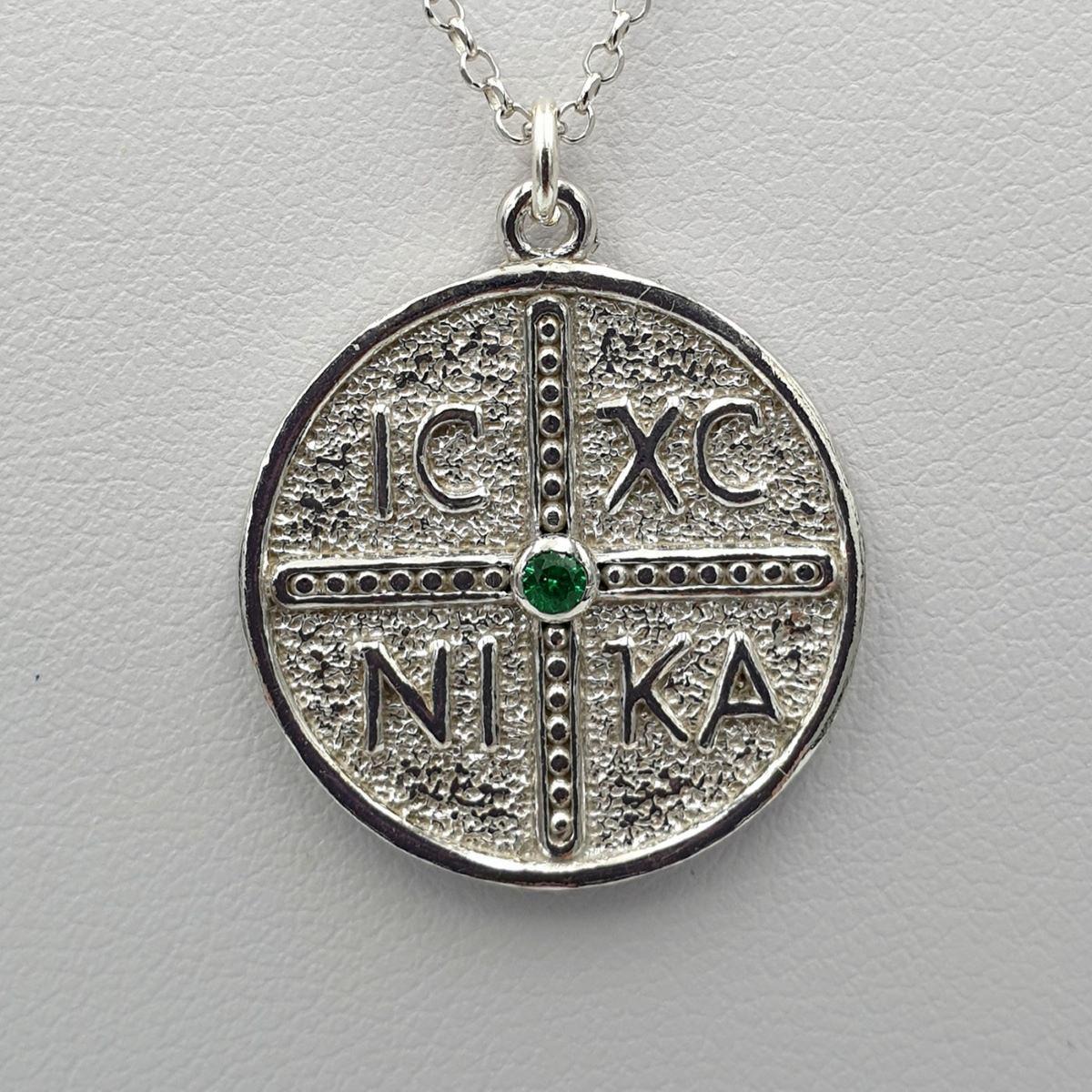 Φλουρί Κωνσταντινάτο ασήμι 925 λευκό με πράσινη πέτρα Ζιργκόν, αλυσίδα 50 cm.