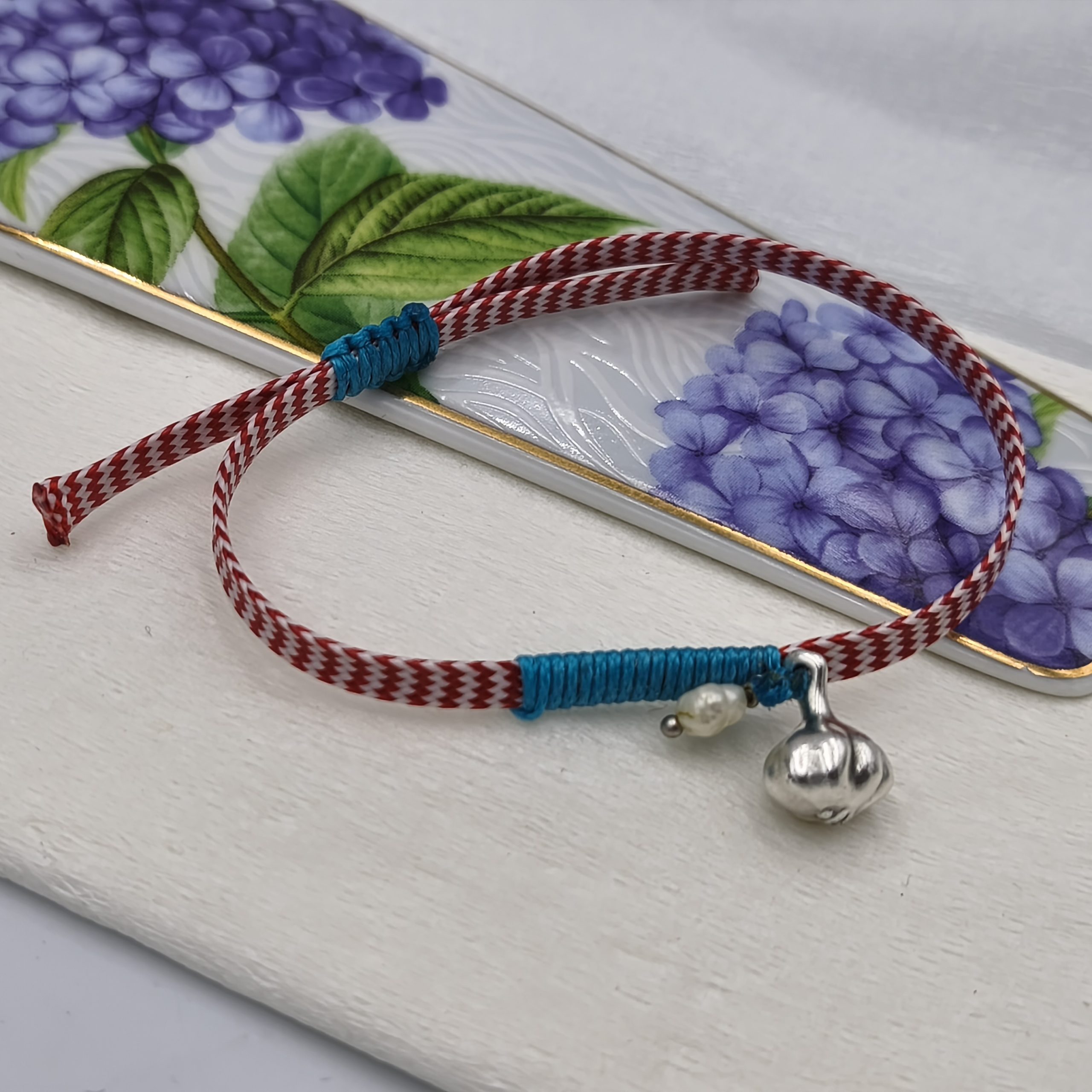 Χειροποίητο βραχιόλι για το Μάρτη με χυτό επαργυρωμένο σκορδάκι, μαργαριτάρι και τυρκουάζ κορδόνι