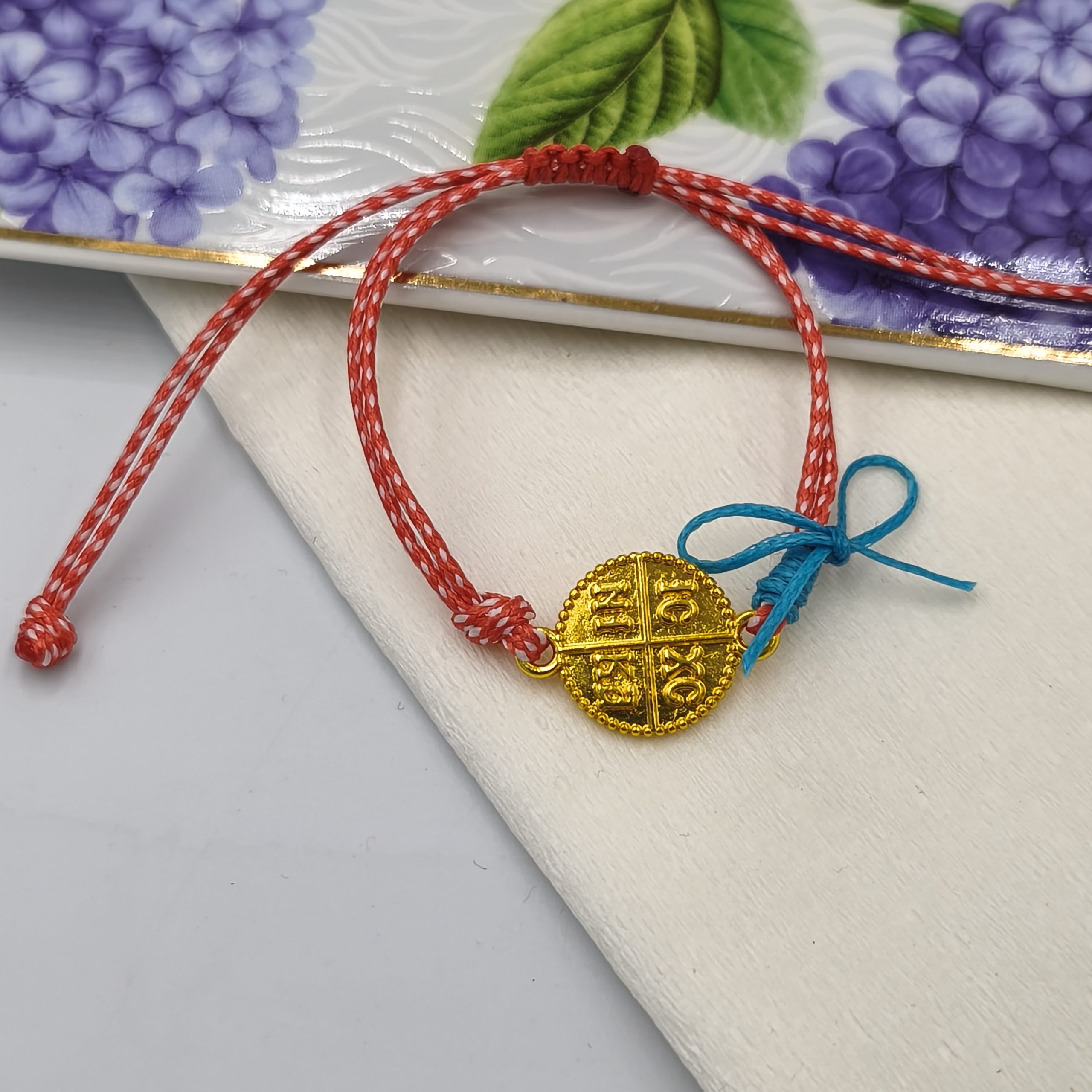 Χειροποίητο βραχιόλι για το Μάρτη με μεταλλικό χρυσό Κωνσταντινάτο και τυρκουάζ κορδόνι