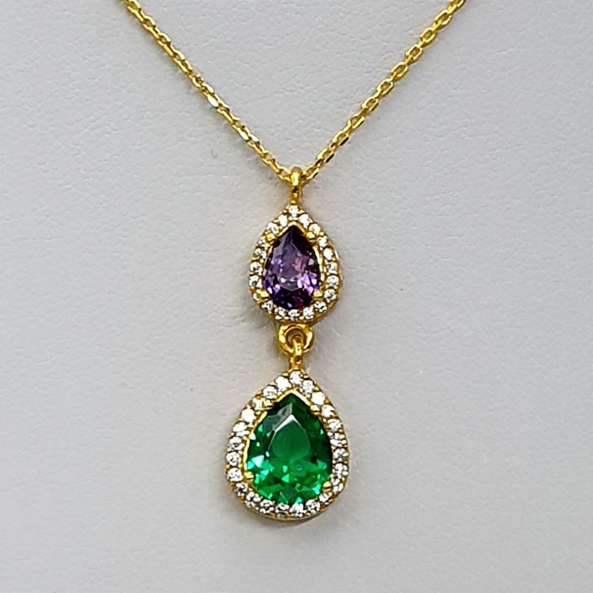 Vintage Ροζέτα διπλή επιχρυσωμένη, ασήμι 925 σε μωβ και πράσινο ζιργκόν οι μεγάλες πέτρες και λευκά ζιργκόν οι μικρές. 40 cm η αλυσίδα.